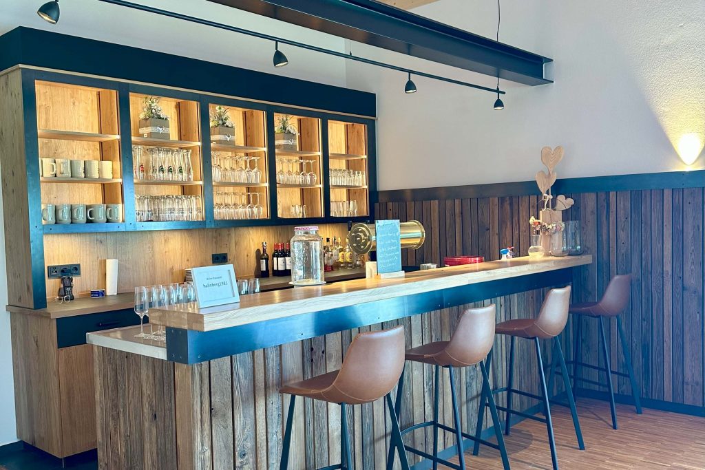 Ein besonderes Highlight ist die elegante Bar aus Eichenholz, die sich perfekt für Kaffeepausen oder ein Gespräch mit den Kollegen eignet. Hier trifft modernes Design auf natürliche Materialien – ein Ort, an dem sich Teams wohlfühlen.