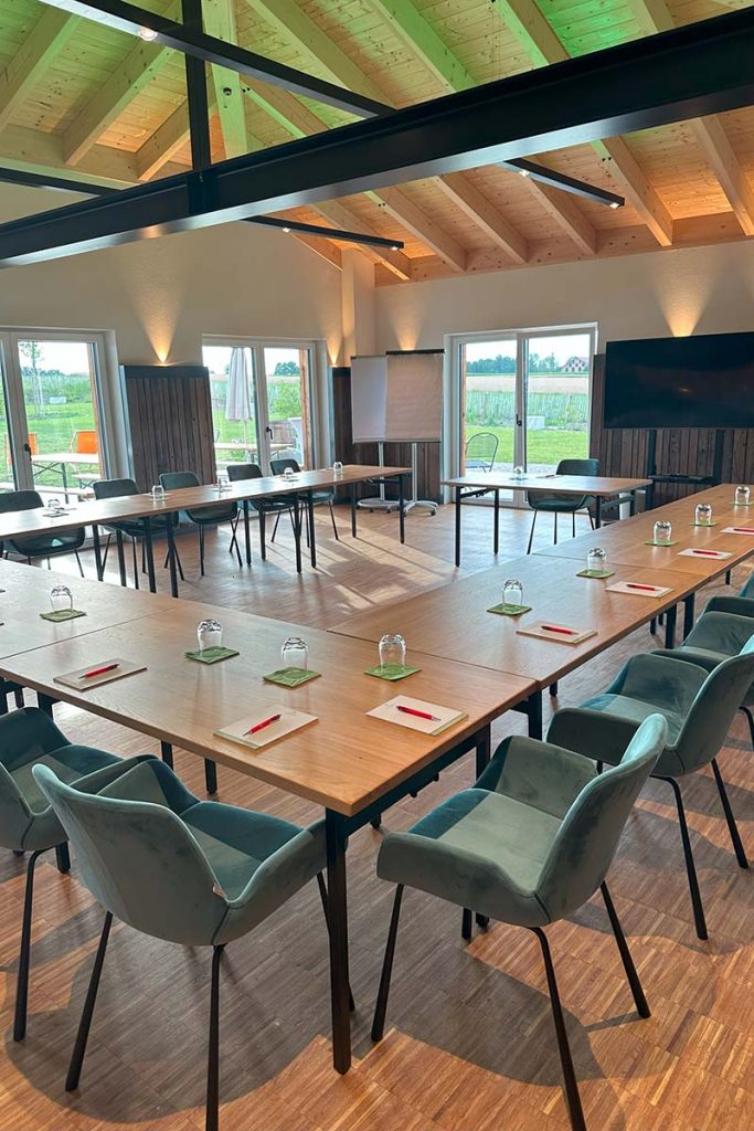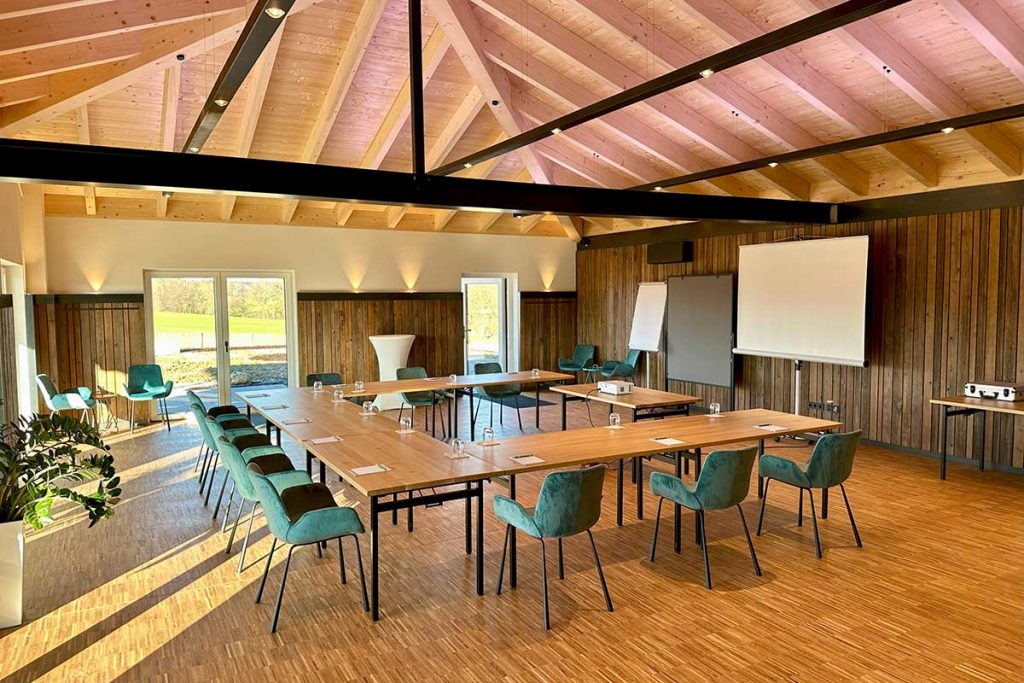 Der neue Tagungsbungalow im Landhotel Hallnberg begeistert mit warmem Eichenholz, klarer Architektur und großen Fensterfronten mit Blick in den Garten. Auf 90 m² lichtdurchfluteter Fläche erwartet Sie ein Raum, der Ruhe und Inspiration vereint – ideal für konzentriertes Arbeiten und kreative Workshops.